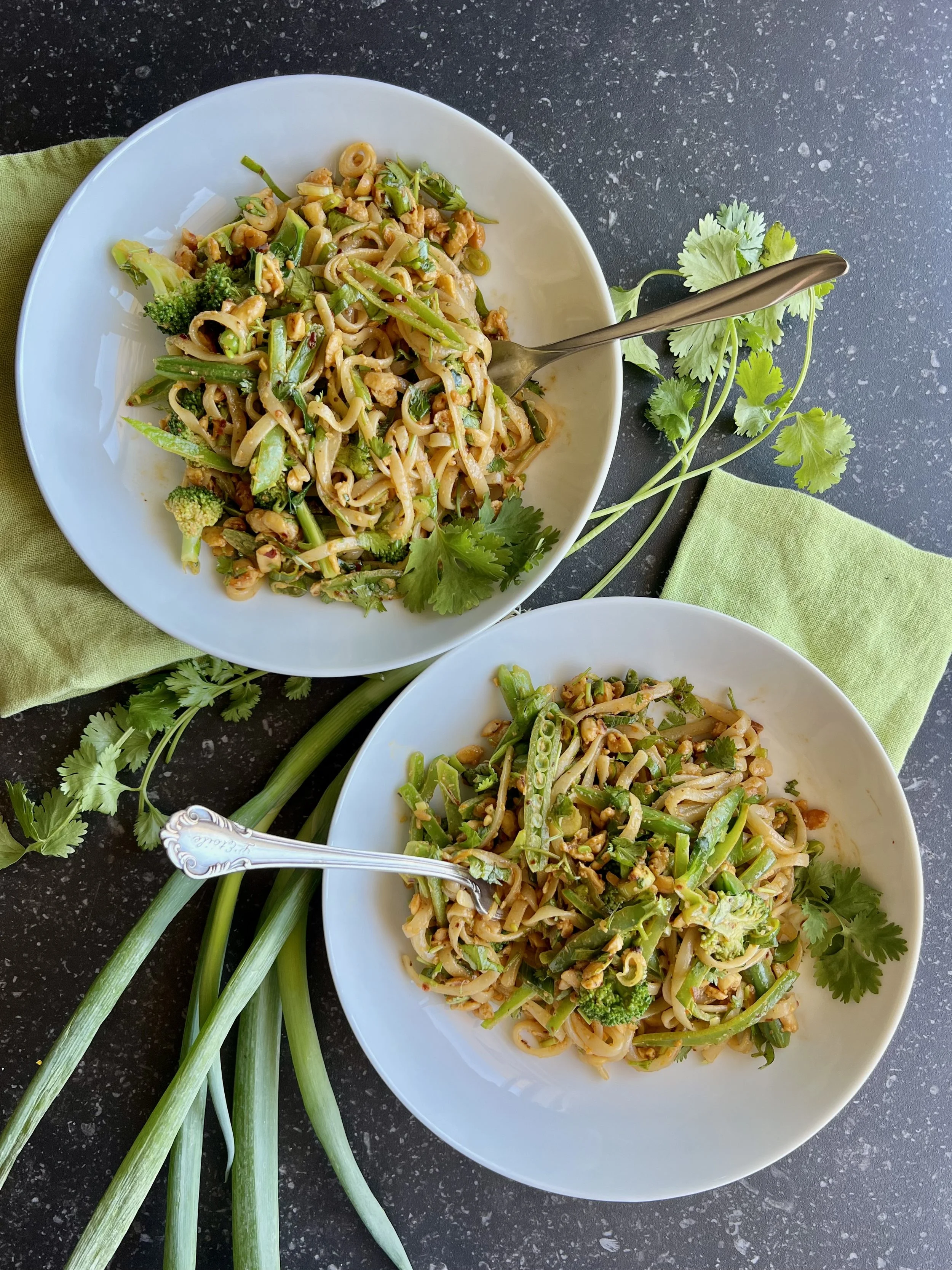 1 minute before the noodles are fully cooked add the broccoli and snap peas to the boiling water with the noodles to blanch.
