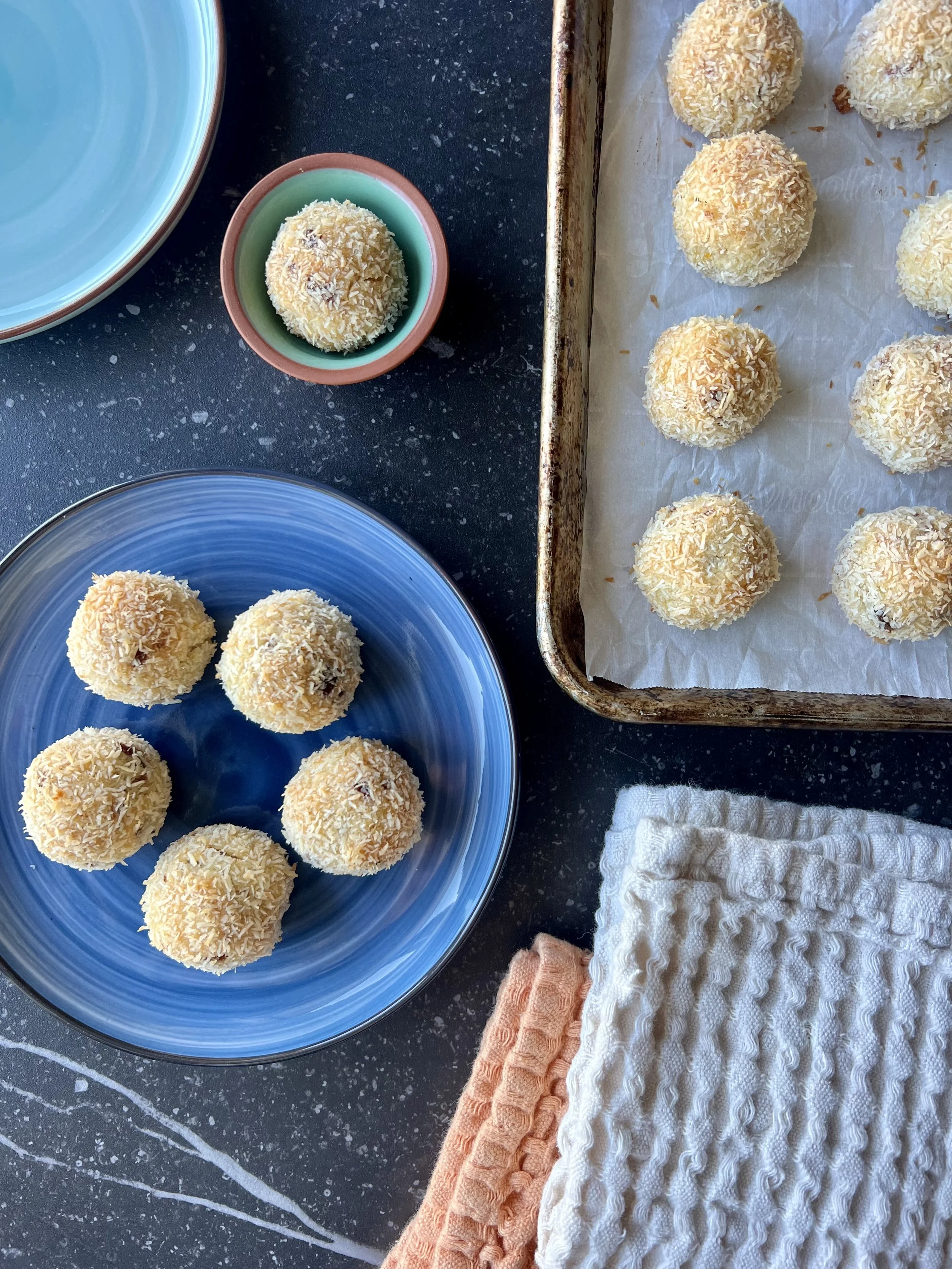 Roll the formed balls in the remaining coconut and place on a parchment lined baking sheet. The cookies won’t spread so they can all be placed close together on one baking sheet.