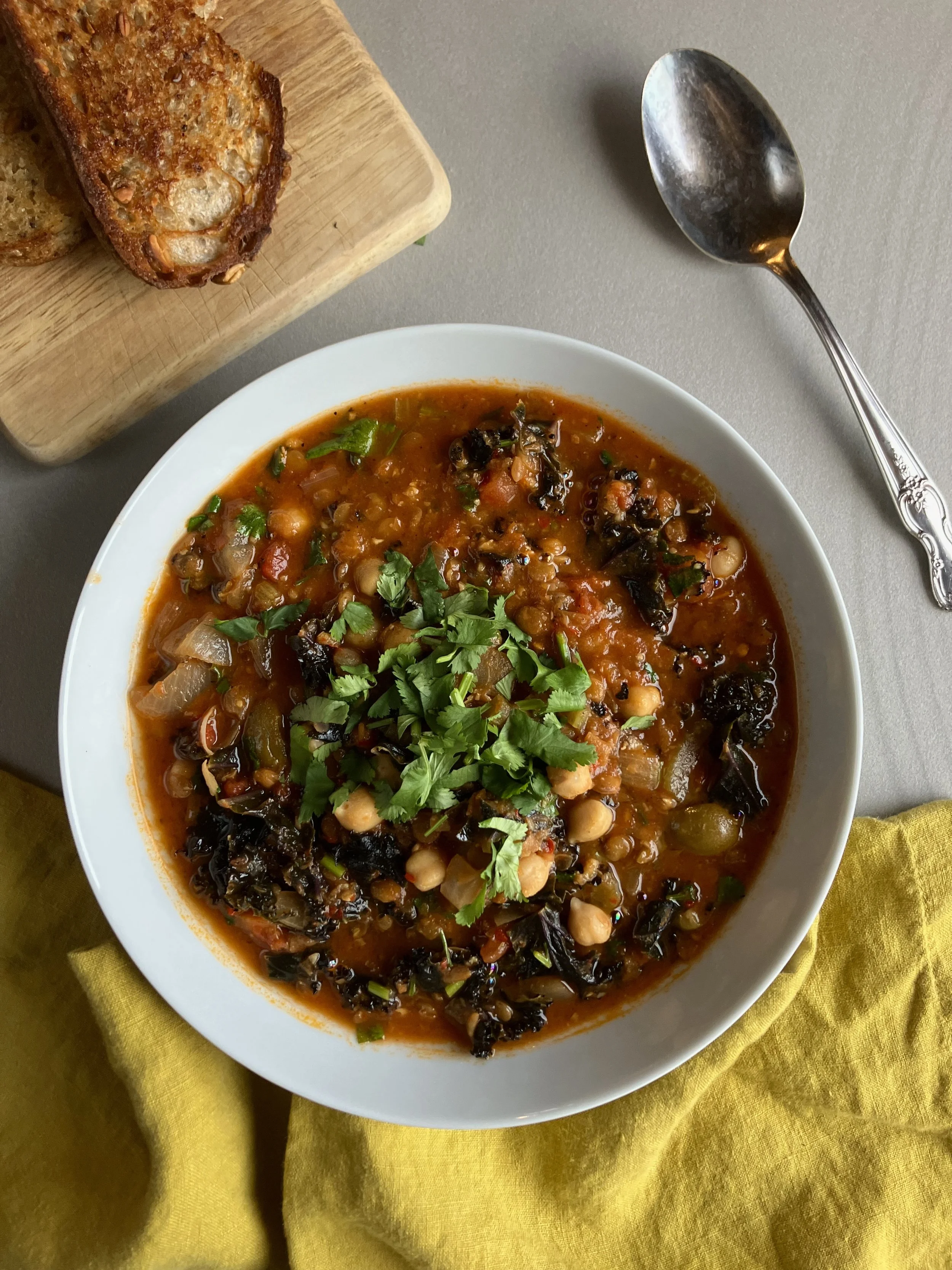 This soup is one of my favorites! My palate loves to be stimulated and this soup has a lot going on. The briny pop of olives are the best part (in my opinion) but you also have loads of veggies with a kick of heat, zip from lemon and freshness from the cilantro. The level of heat varies from one harissa paste to another so be sure to test yours before adding.